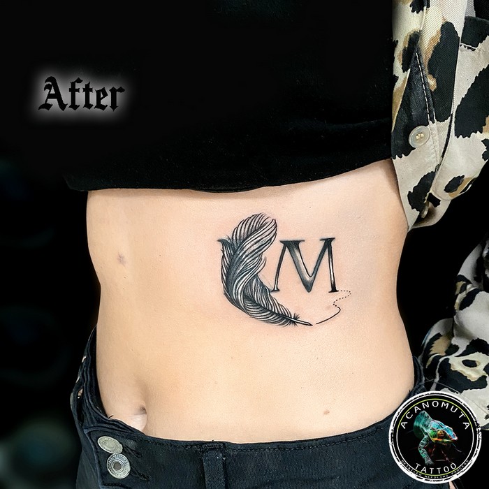 Category:ΑσπρόμαυραTags:cover up tattoo, feather tattoo, monogram tattoo, side tattoo